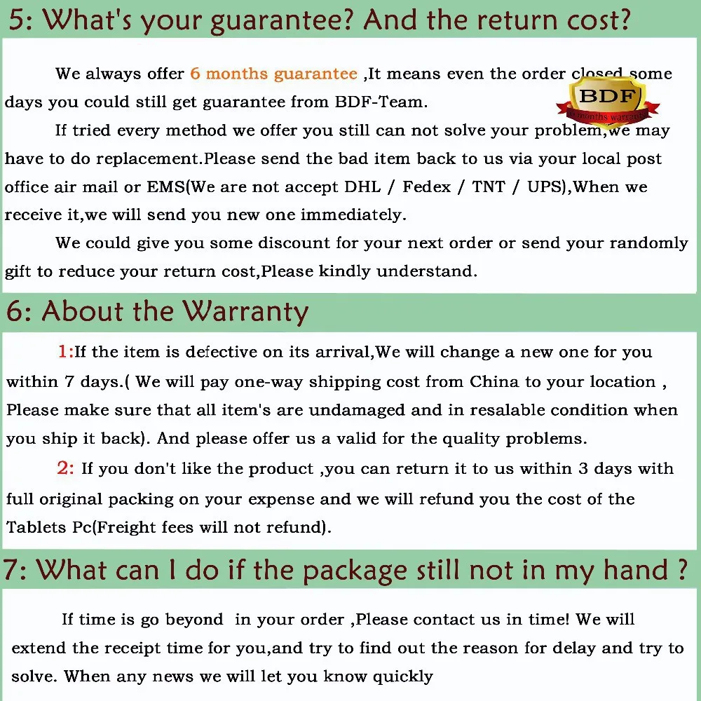 • If you did not receive the product within the guaranteed time( 45 days not including 2-5 day processing) you can request a refund or a reshipment.