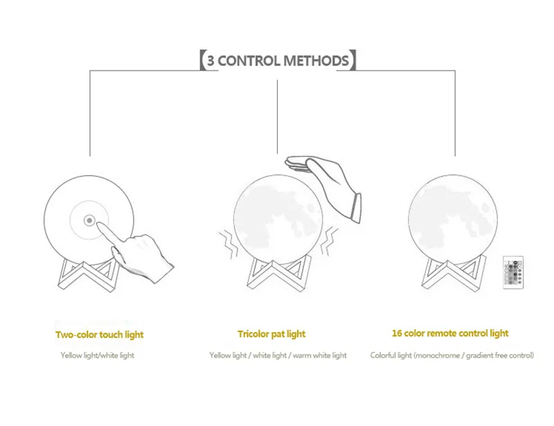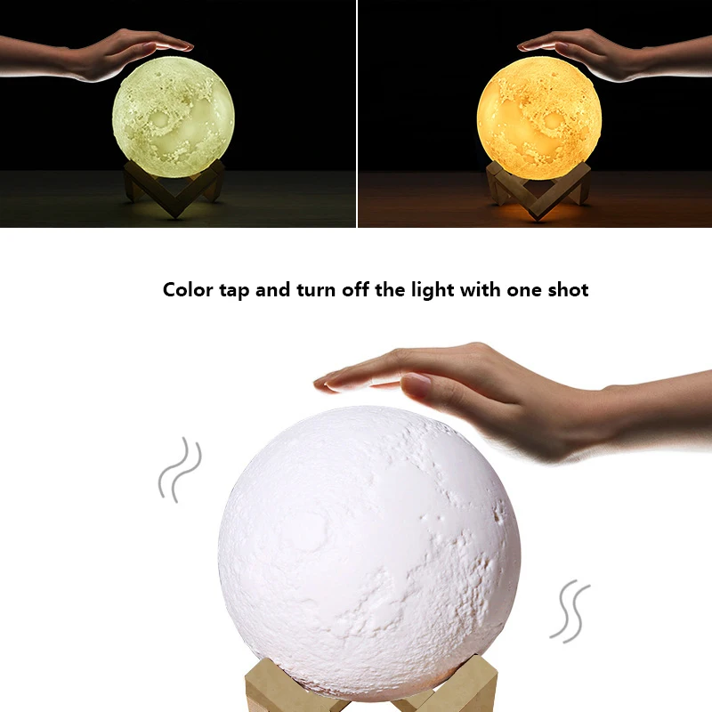 1. Touch the metal ring at the bottom of the moon lamp to turn on / off the light and change color from white to yellow.