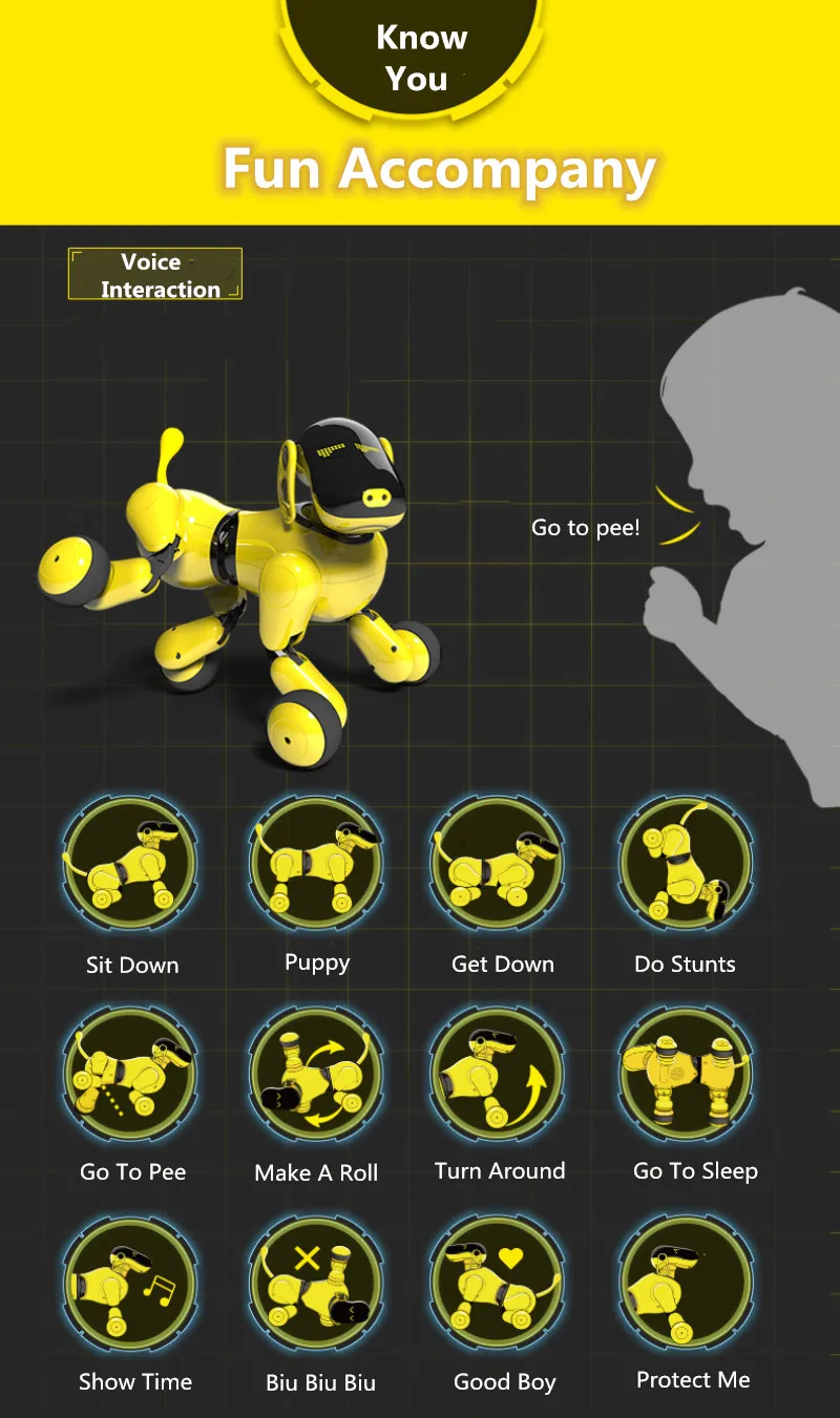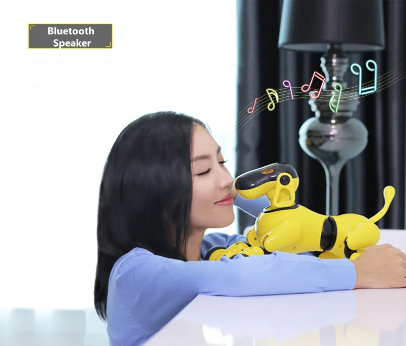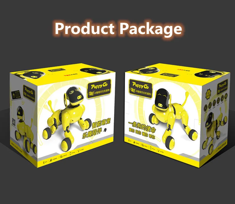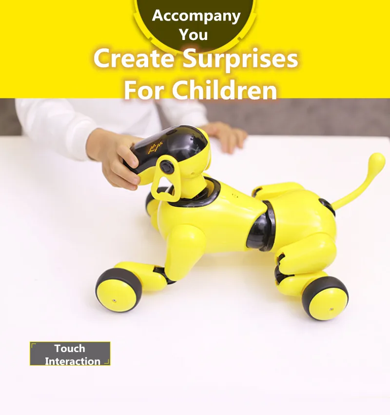 3. The robot dog has eleven different play modes: forward and backward, left and right,sing,dance, APP control, growth teaching,feeding and raising,bluetooth speaker,voice commands interaction, touch sensor interaction,intelligent programming