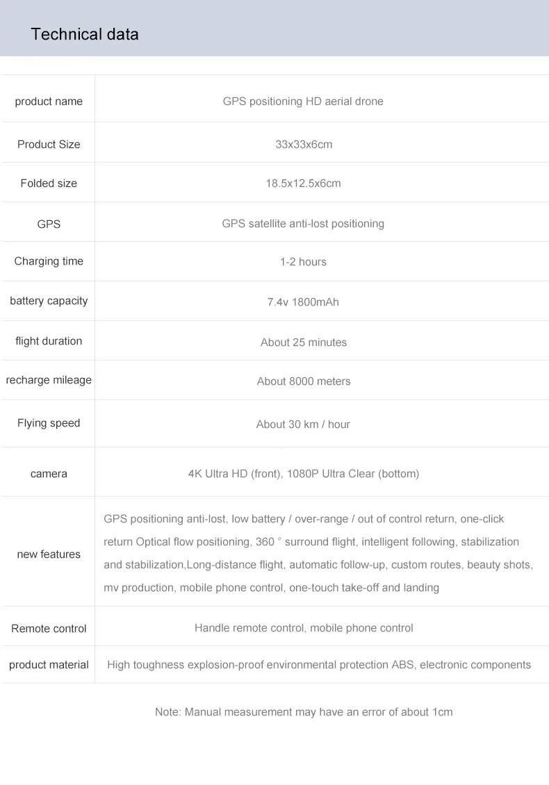 Functions: Up / Down, Forward / Backward, Left / Right, Lateral Flight, Level 3 Flight Speed, LED Light, GPS Positioning, Follow Me, Flight Around, Waypoint Flight, Altitude Hold Mode, Headless Mode , One-button return, one-button take-off / landing, WiFi FPV, camera / video