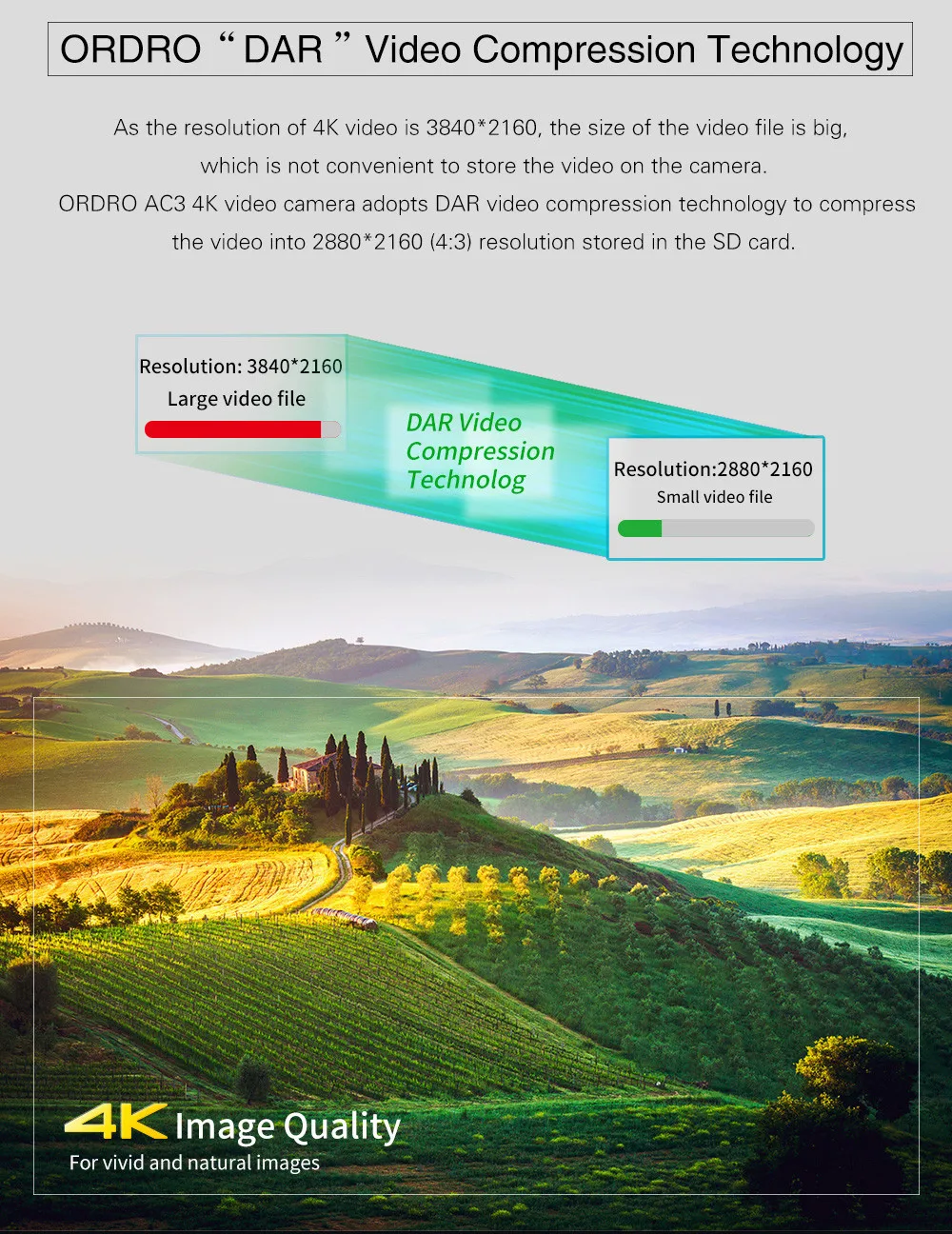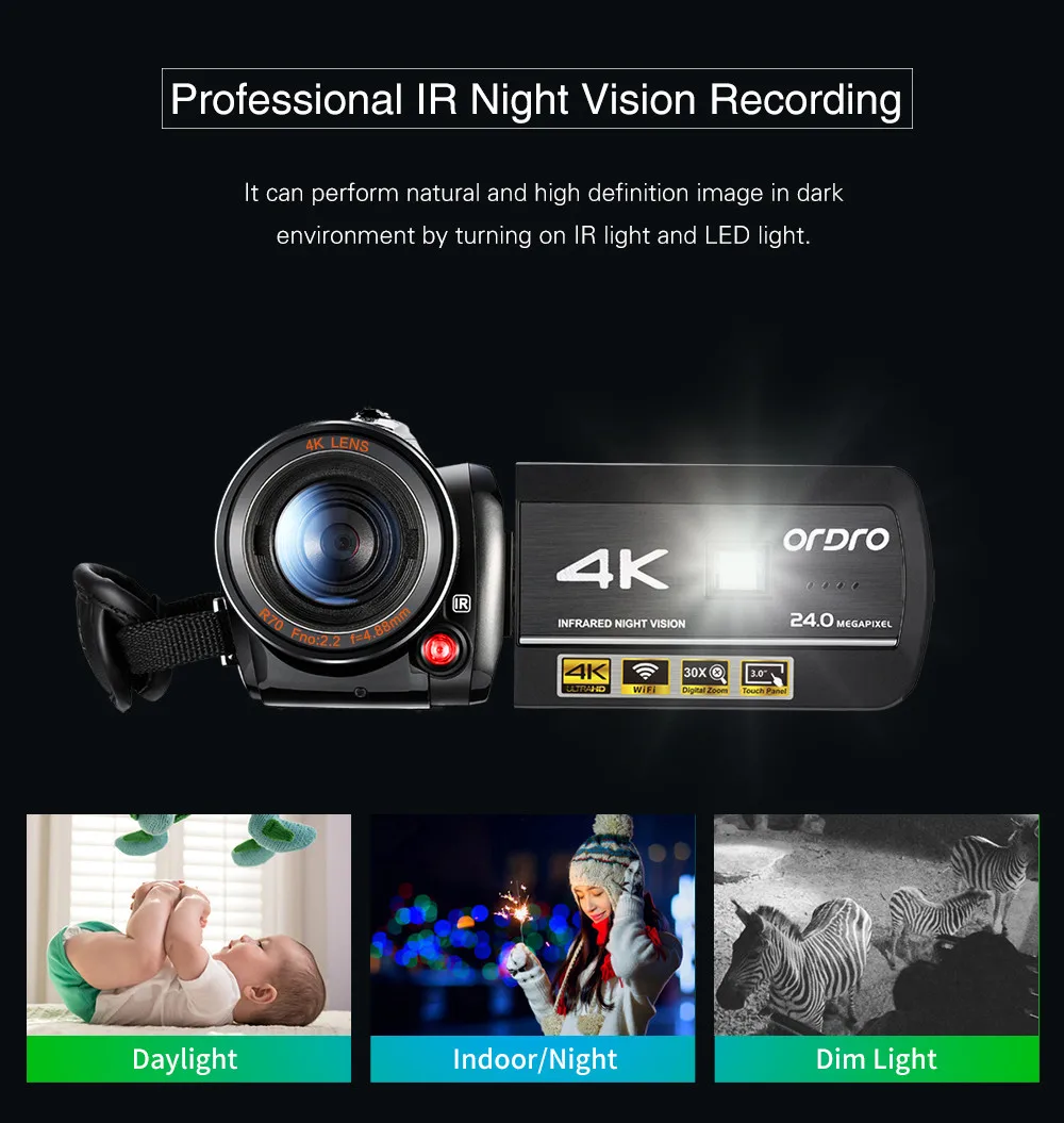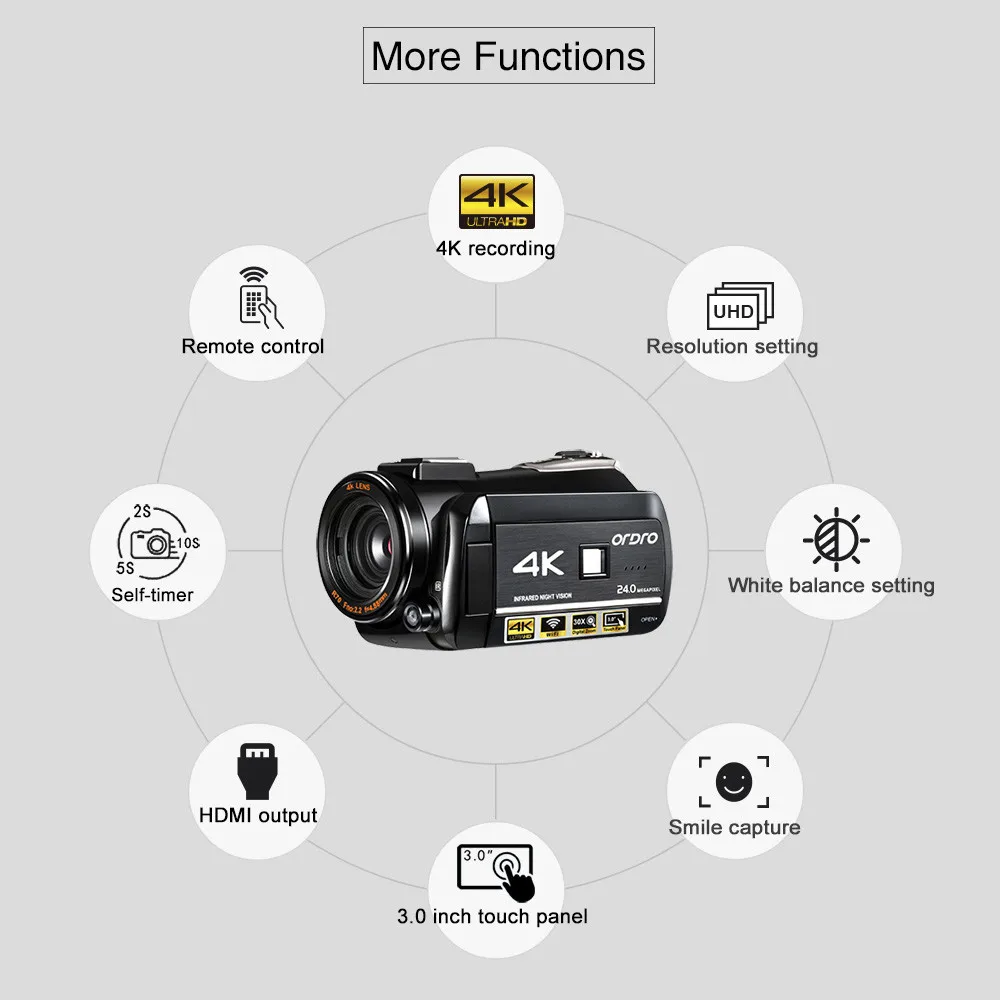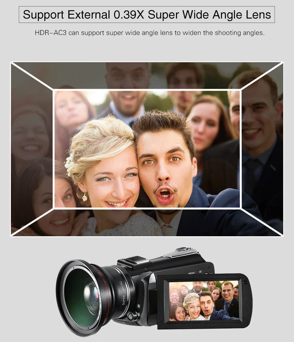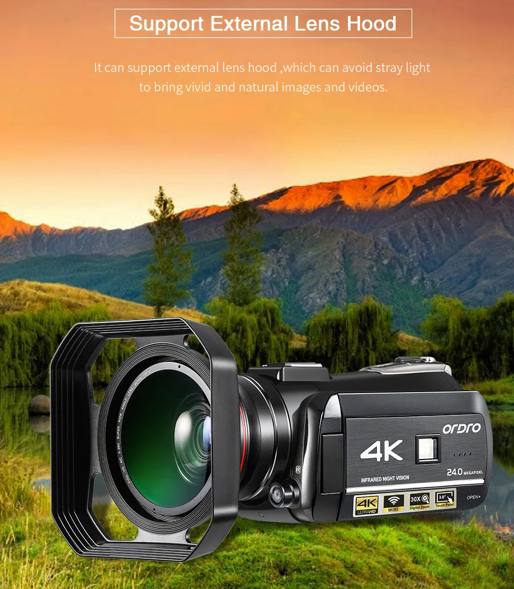 ORDRO AC3 4K Ultra HD 60FPS Video Camera with Wifi External Microphone Wide Angle Lens and Lens Hood