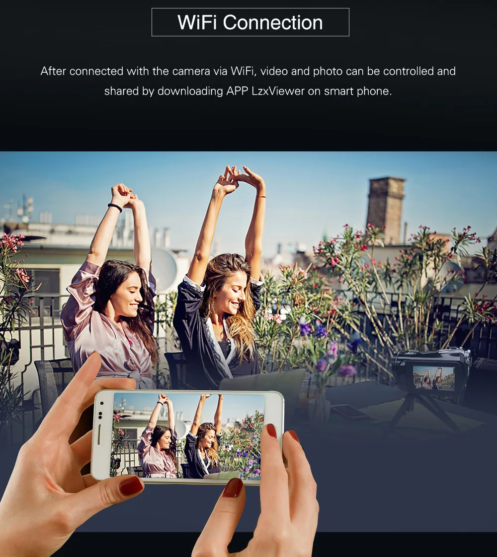 【WIFI FANCTION】 – Built-in Wifi, open wifi mode, you can see wifi account and passwords shown on the screen, use your phone or tablet to finish the connection. Please download “LzxViewer” APP first and open it to control camcorder: playback, record, photo, download files. WiFi effective range ≤ 9.8 feet.