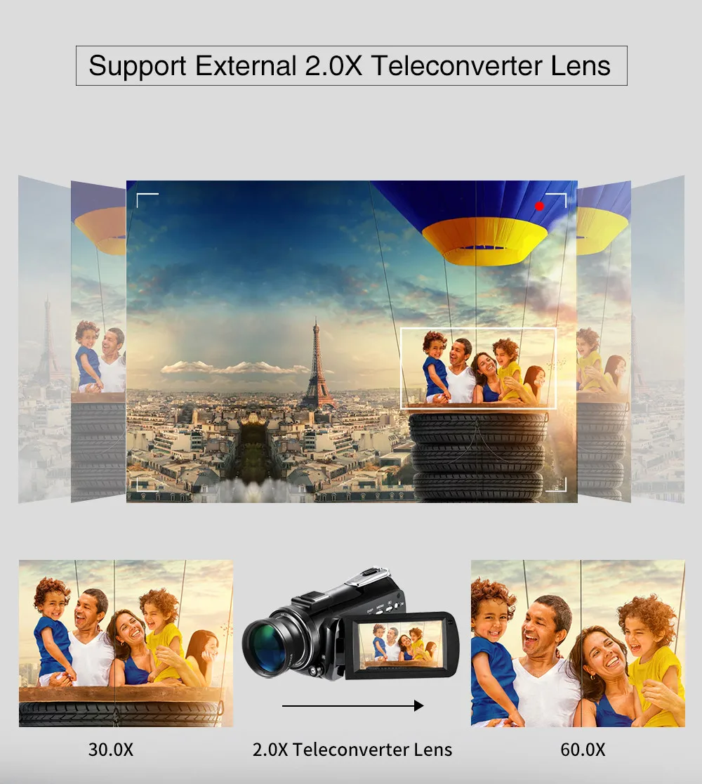【NEW ADVANTAGE】 – 13.0MP Sony CMOS sensor 1/3.02 inch, 4K 3840*2160 24fps, MP4/H.264 format, max 24MP interpolation resolution, 30X digital zoom, HDMI output, 2 LED lamps, 3.0 inches TFT LCD touch screen,Anti-shake, unique face detection, smile capture, self-timer auto shoot & camera , IR remote controlled.