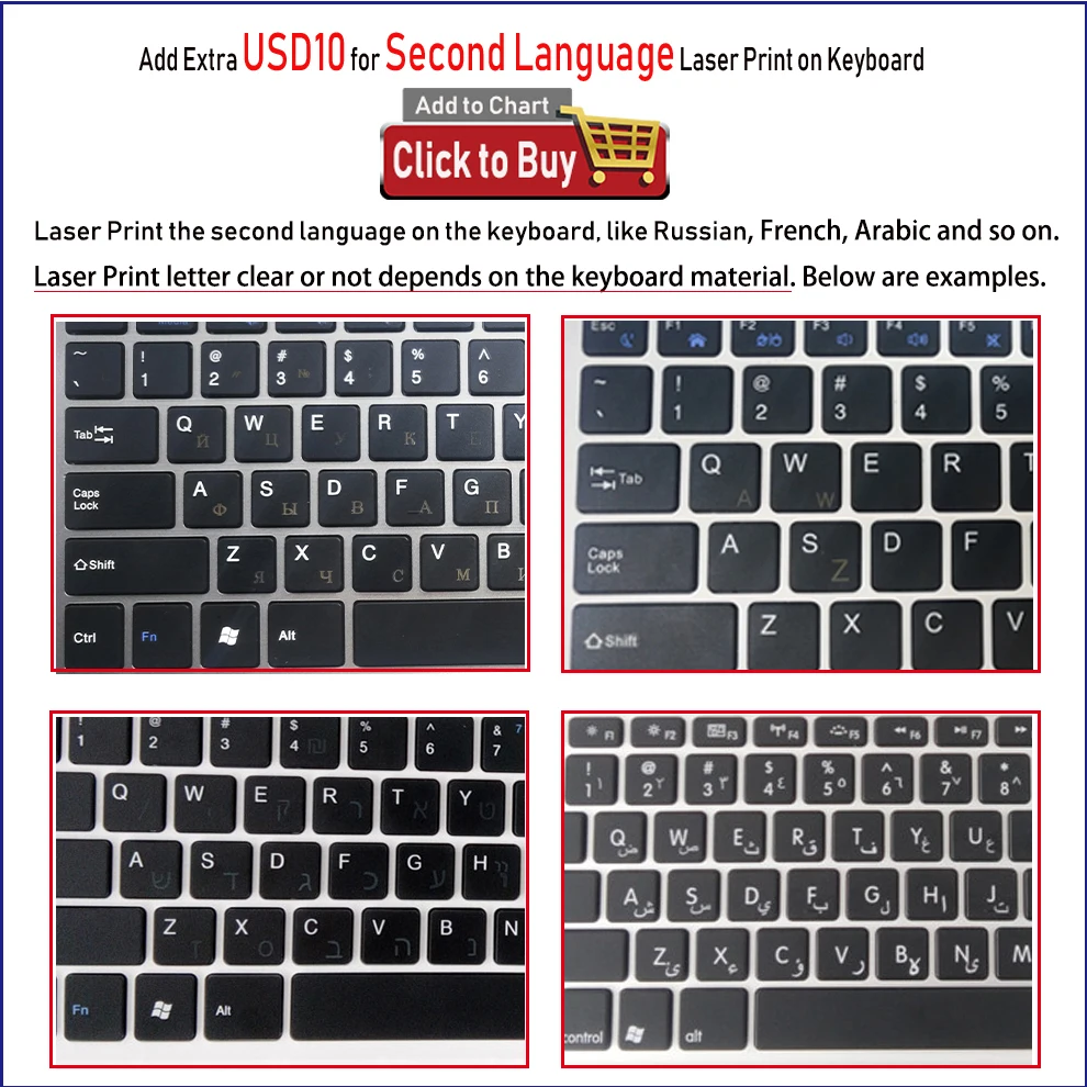 1. The keyboard is English as default. but we support print second language on the keyboard,but you need to pay extra 10$.please contact us if you want