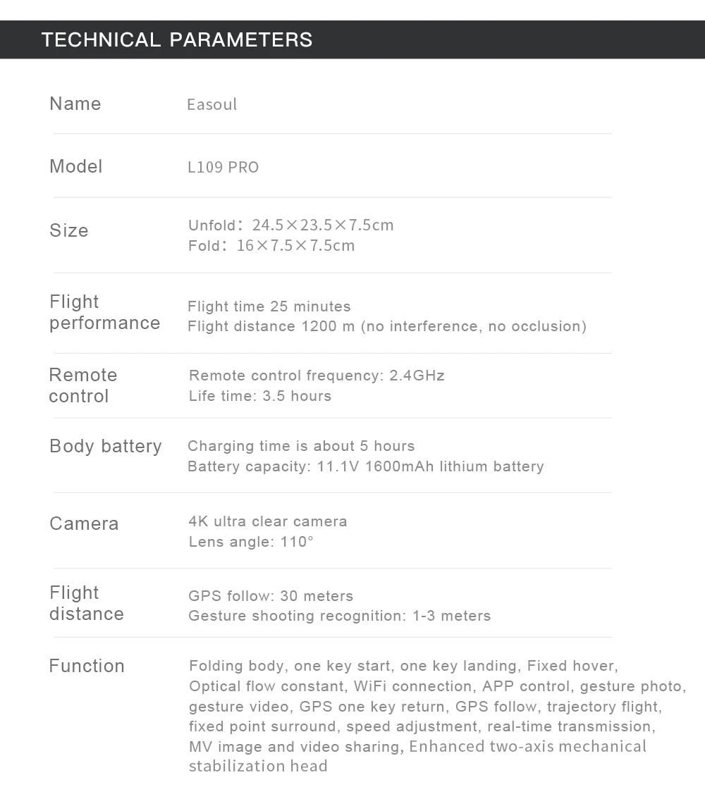 Quadcopter Size: 24.5*23.5*7.5cm (Unfoldable),16*7.5*7.5cm(Foldable)