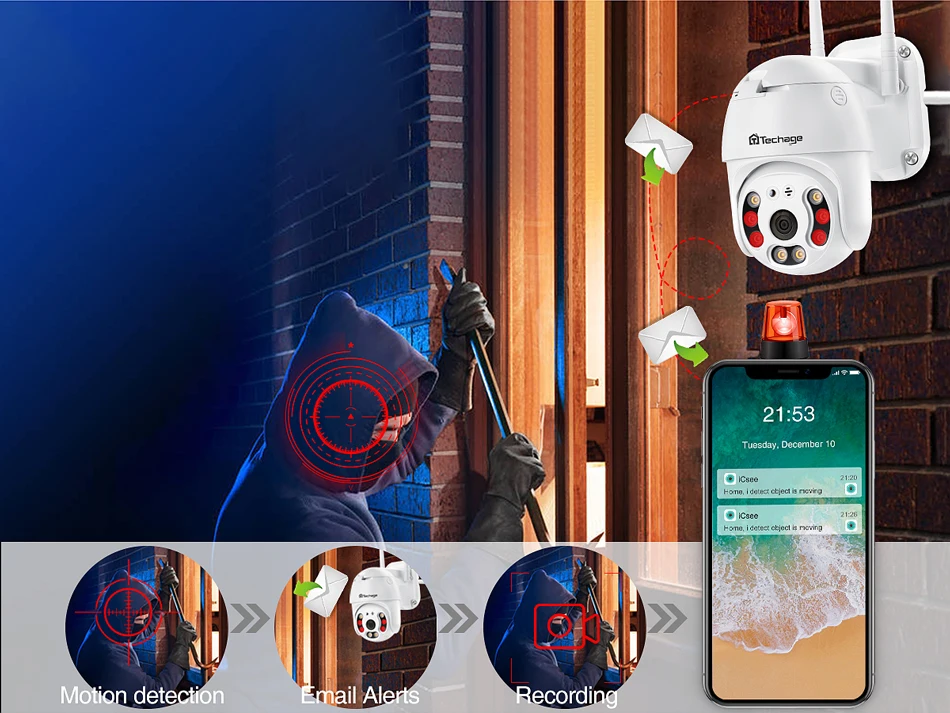 When someone breaks into shooting area, the camera will make alarm sound and alarm messages will be pushed to your Phone APP 4PCS White LED Lights , When it motion detect , the 4 Leds will light